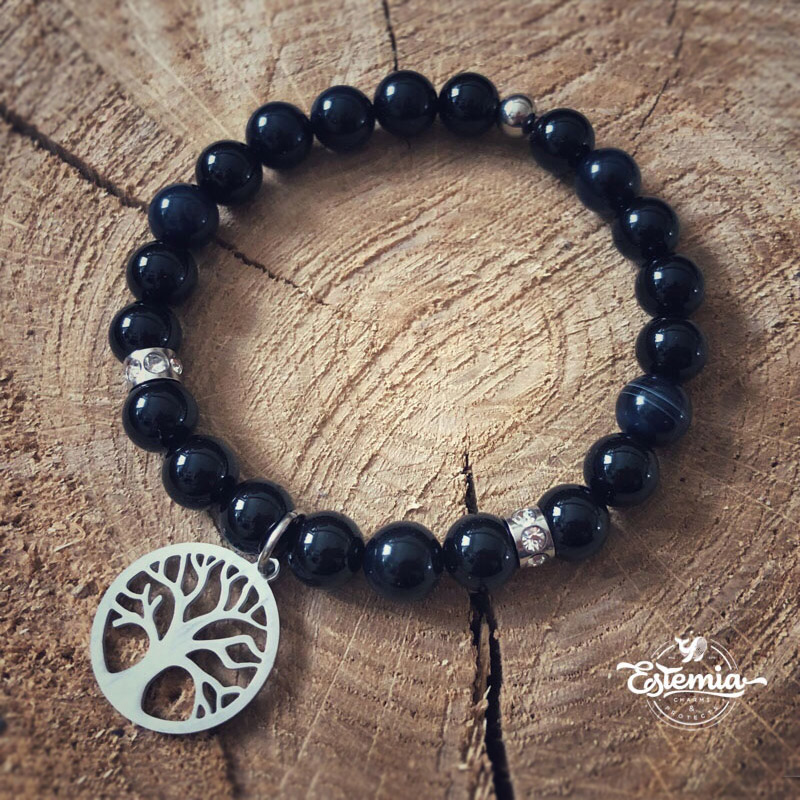 Minerální náramek strom života z chirurgické oceli a z černého achátu.