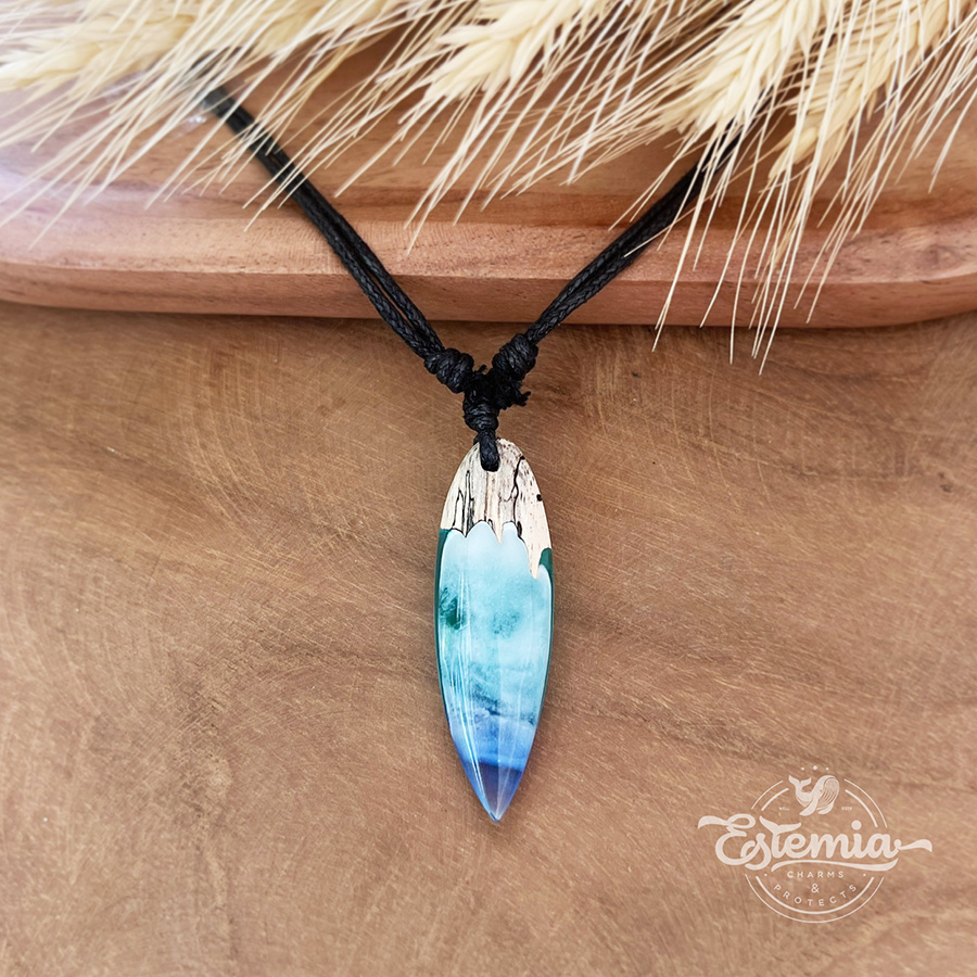 Průzračné modré tóny připomínají ledovcové jezero nebo hladinu oceánu, pod níž se skrývá hloubka a síla. Dřevo pak symbolizuje pevné ukotvení, spojení se zemí a přirozený řád. Voda je symbolem emocí, intuice a očisty. Tento přívěsek jemně podporuje schopnost zklidnit mysl, pročistit vnitřní prostor a nahlédnout pravdu bez zkreslení. Je vhodný pro ty, kteří hledají rovnováhu mezi citem a rozumem, lehkost a zároveň stabilitu.