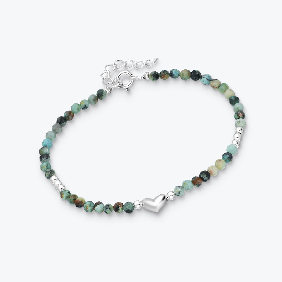 Minerální náramek z broušeného afrického tyrkysu se stříbrným srdíčkem a korálky - Ag925