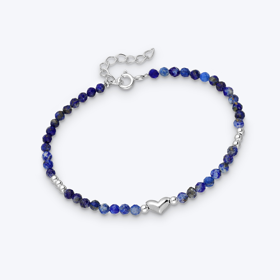 - Minerální náramek z broušeného lapis lazuli se stříbrným srdíčkem a korálky - Ag925