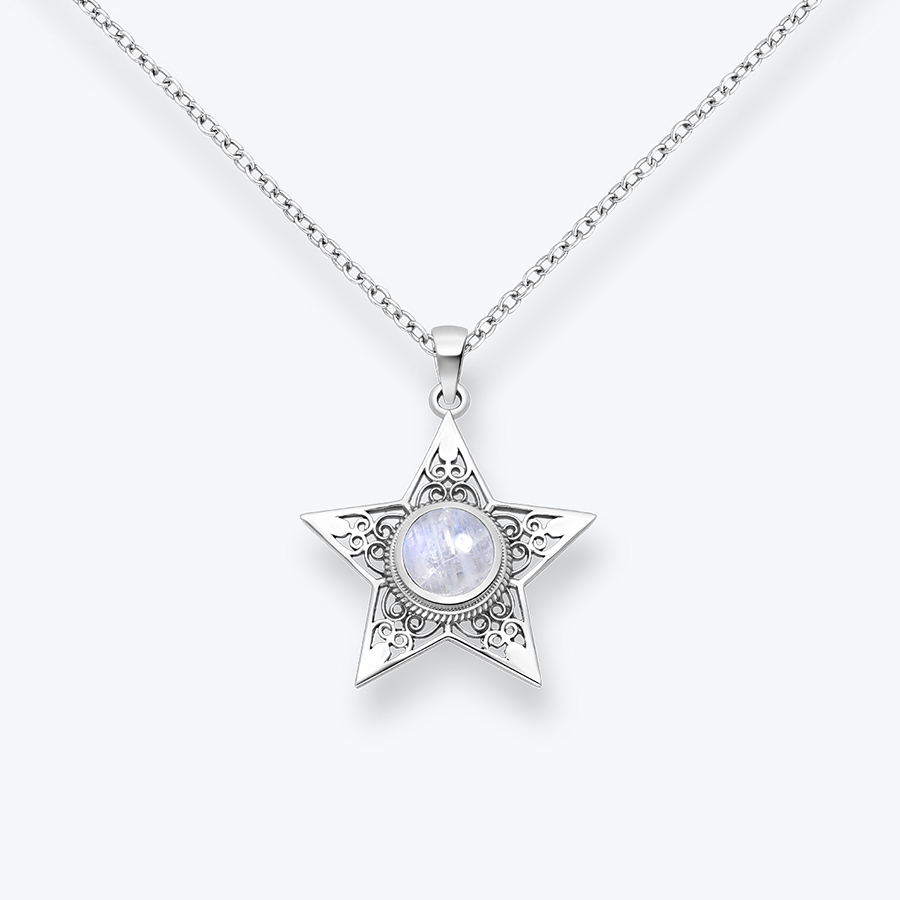 Stříbrný náhrdelník Hvězda s měsíčním kamenem je velmi elegantním šperkem, který se hodí pro každou příležitost. Hvězda symbolizuje světlo, naději a cestu za osobním růstem. Její paprsky jako by připomínaly jiskru ve vašem nitru.