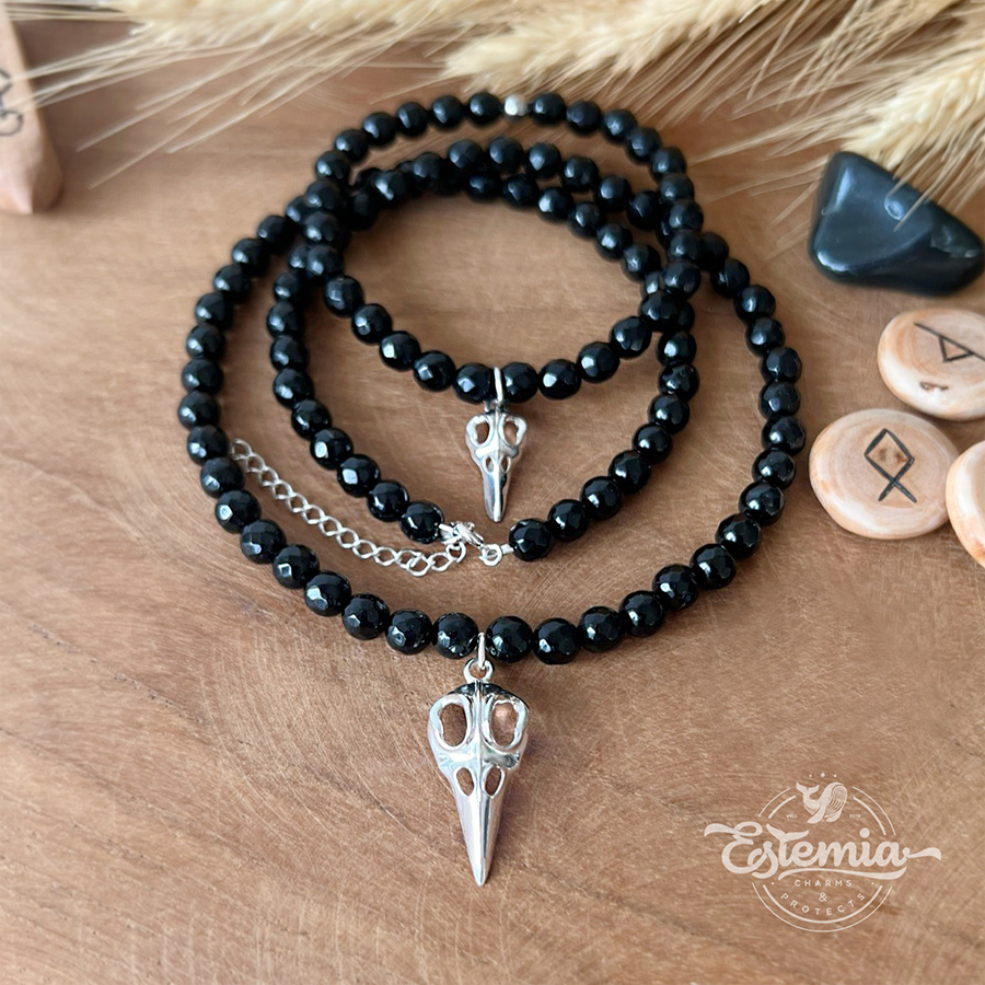 Sada šperků z broušeného onyxu a s lebkou havrana ze sterlingového stříbra Ag 925/1000 je tajemným amuletem s hlubokou symbolikou. Tento onyxový náramek s náhrdelníkem je vhodný pro každého, kdo se nebojí jít svou vlastní cestou a chránit svůj prostor.
