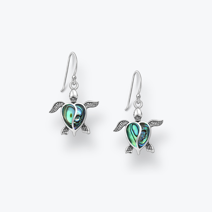 Stříbrné náušnice ve tvaru želvy s mušlí paua jsou módním, ale hlavně překrásným šperkem. Visací náušnice s želvami dodají správný šmrnc vašemu outfitu. Celkový dojem je velmi originální.