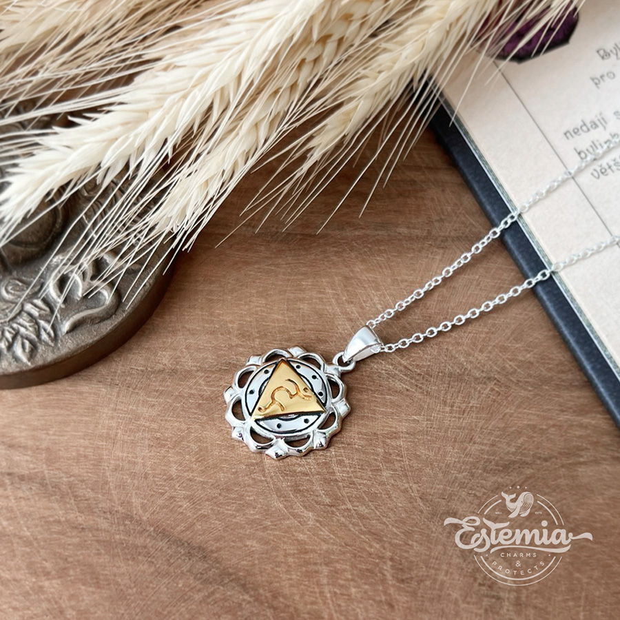 Stříbrno-zlatý řetízek Krční čakra zajímavě kombinuje oba kovy a spolu s patinou dodává šperku originální styl. Jemné stříbro, které tvoří základ náhrdelníku, symbolizuje čistotu, nadhled a ochranu. Jeho chladná elegance je nádherně vyvážena teplými tóny zlata, které obklopují symbol krční čakry (Vishuddhy). Zlato představuje bohatství, hojnost a vnitřní sílu, a jeho spojení se stříbrem vytváří harmonický kontrast, který je jak esteticky krásný, tak i duchovně hluboký.
