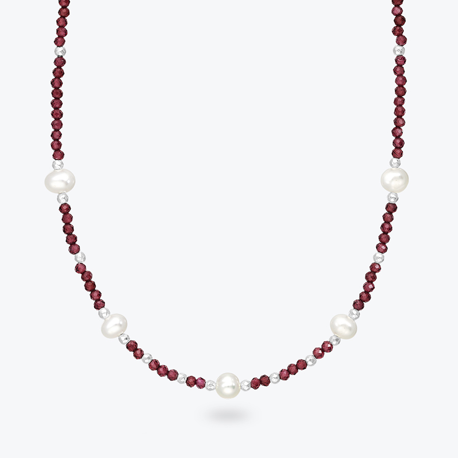 Dámský minerální náhrdelníkz broušeného granátu, říčních perel a stříbrných korálků. Jemné korálky granátu jsou doplněny říčními perlami a korálky ze sterlingového stříbra Ag 925/1000. Na krku působí velice něžným a zajímavým dojmem. Nosí se těsně kolem krku jako tzv. choker. Náhrdelník z granátu je lehoučký, příjemně sedí a broušené plošky jednotlivých korálků se na světle decentně blýskají.