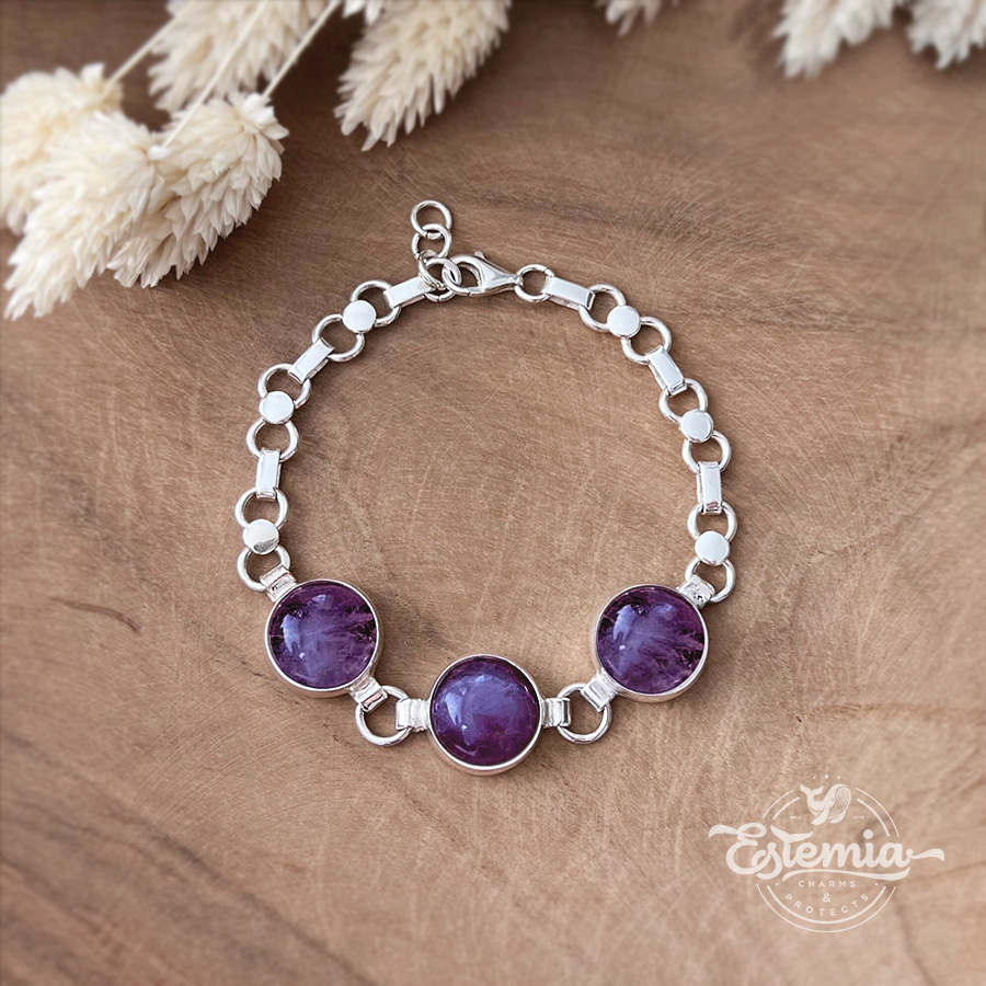 Stříbrný náramek s kabošony ametystu.
