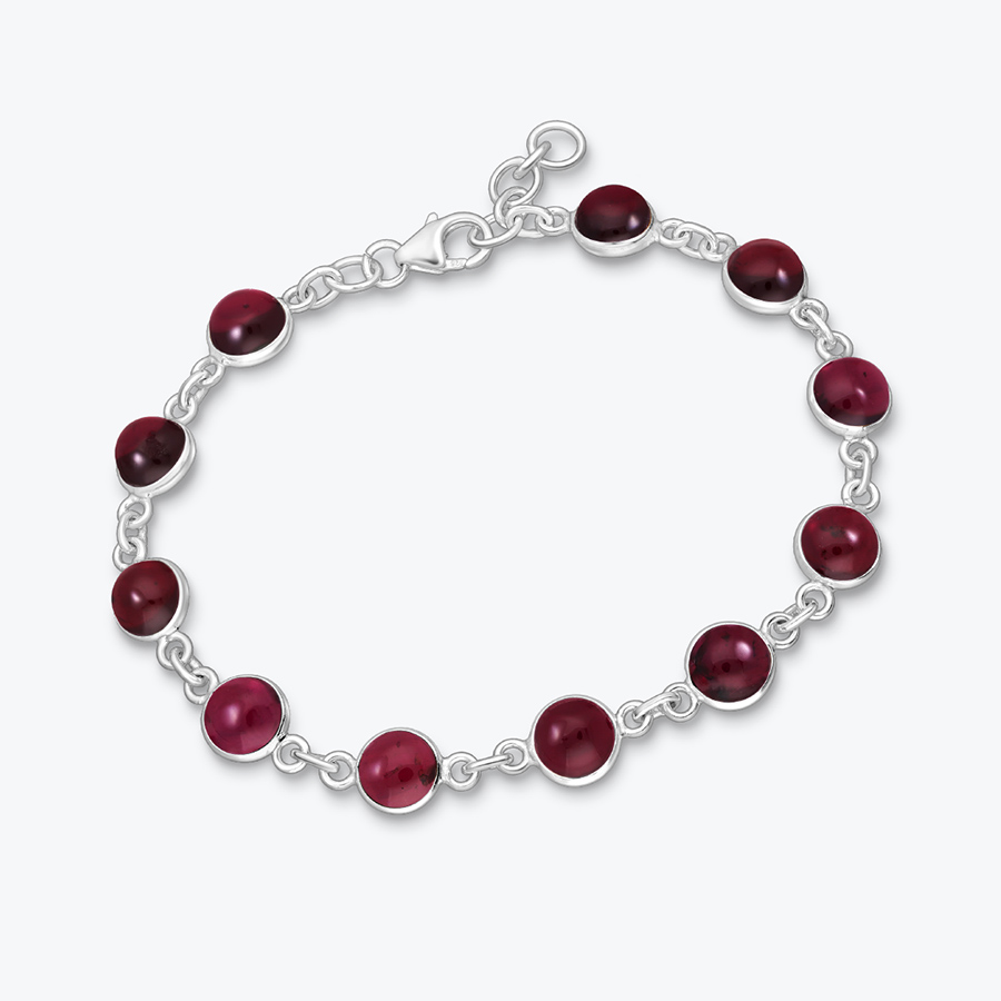 Dámský stříbrný náramek s granátem je naprosto magickým klenotem. Pokud máte ráda elegantní přírodní šperky a ráda při sobě nosíte minerální kameny, pak vám tento náramek rozhodně doporučujeme. Jedná se o slušivý a velice zajímavý kousek. Precizně zpracovaný náramek je ručně vyroben ze sterlingového stříbra Ag 925/1000 a je osazen kabošony granátu.