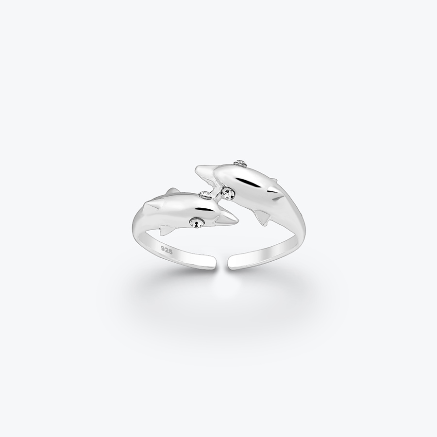 Stříbrný prsten ve tvaru dvou delfínů se zirkony je stylovou ozdobou pro vaše nožky. Dopřejte jim sexy vzhled a obdivné pohledy na každém vašem kroku vás jistě neminou. Prstýnek vás originálně ozdobí zejména na jaře a v létě. Své nožky však můžete zkrášlit i kdykoliv během roku, například během plesové sezóny, pokud se chystáte na lekci jógy či plavání a chcete svým bosým chodidlům dopřát trochu krásy.