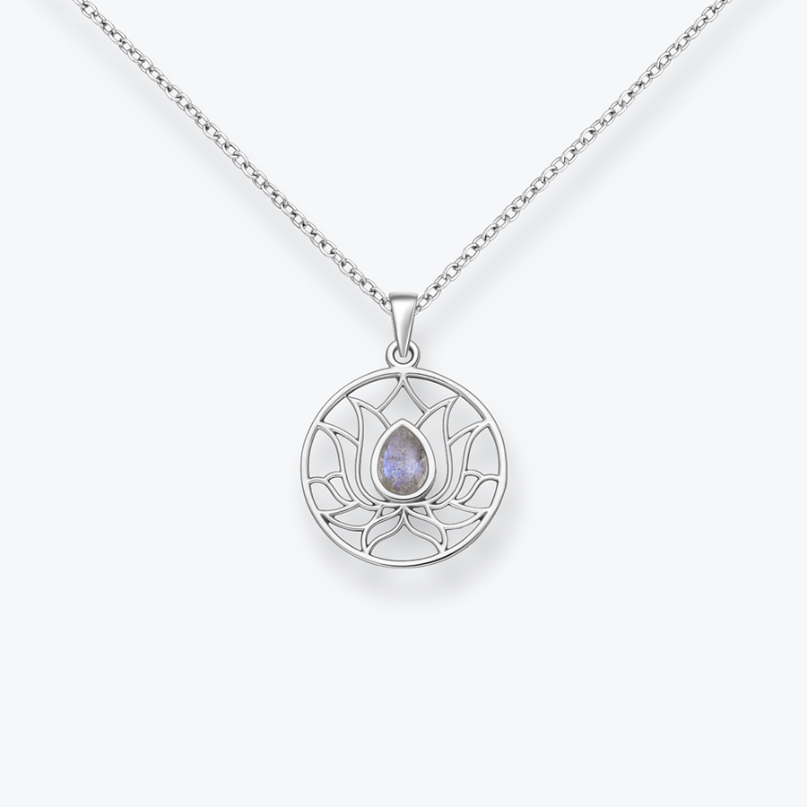 Stříbrný náhrdelník s lotosem a labradoritem ve tvaru kapky je krásným a opravdu unikátním šperkem. Jedná se o decentní a velice elegantní kousek. Precizně opracovaný krystal labradoritu s umělecky tvarovaným lotosovým květem vám učaruje. Vybrat si můžete ze dvou délek řetízku - 45 nebo 50 cm. Náhrdelník je ručně vyráběný ze sterlingového stříbra Ag 925/1000.