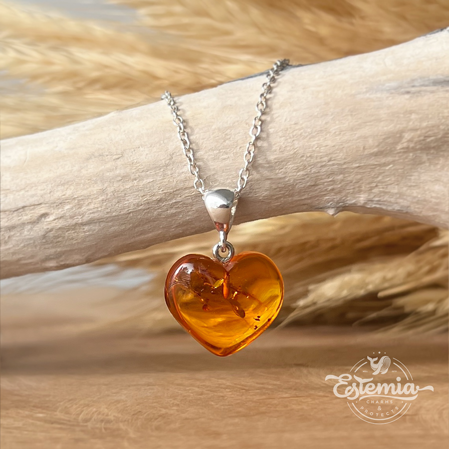 Stříbrný řetízek s jantarovým srdcem.