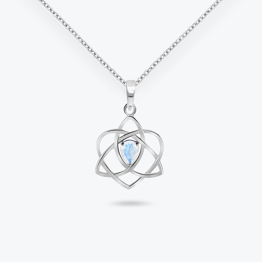 Stříbrný náhrdelník s měsíčním kamenem propojuje dva silné symboly – srdce a triquetru. Uprostřed propletení těchto dvou symbolů je řetízek ozdoben broušeným měsíčním kamenem ve tvaru kapky, což z něj dělá nejen krásný, ale také hluboce symbolický šperk. Srdce, jako univerzální symbol lásky, představuje něhu, vášeň a emocionální spojení. V kombinaci s triquetrou, která symbolizuje věčnost, nekonečnost a propojení tří klíčových aspektů života (například těla, mysli a duše), vzniká silný amulet, jenž reprezentuje stabilitu v lásce, harmonii, věčnou jednotu a duchovní rovnováhu.