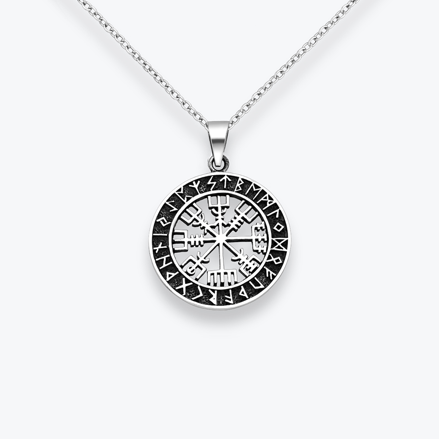 Stříbrný řetízek Vegvísir s patinou a germánskými runami.