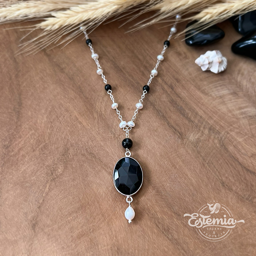 Onyx je znám jako kámen, který symbolizuje ochranu, vnitřní sílu a stabilitu. Černá barva onyxu působí tajemně, přitahuje pozornost a vyzařuje sebevědomí. Jemné říční perly do šperku vnášejí čistotu, nevinnost a ženskost. Jejich třpyt a jedinečná textura dodávají náhrdelníku luxusní vzhled a jemný kontrast k temnému lesku onyxu.