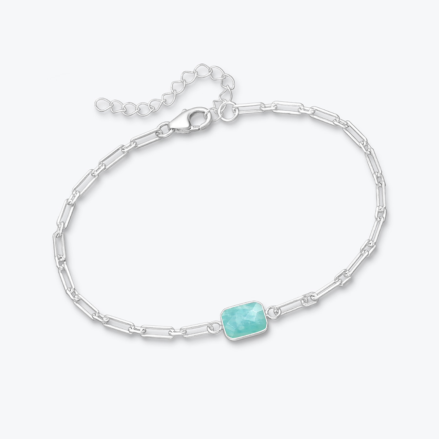 Hranatý podlouhlý řetízek dodává náramku moderní vzhled. Články mají čisté linie a pevnou strukturu, díky čemuž působí současně jemně i sebevědomě. Tvar náramku vytváří na zápěstí zajímavou texturu a krásně zachytává světlo při pohybu ruky. Jeho střed je ozdoben broušeným amazonitem zasazeným do hladké stříbrné obruby.