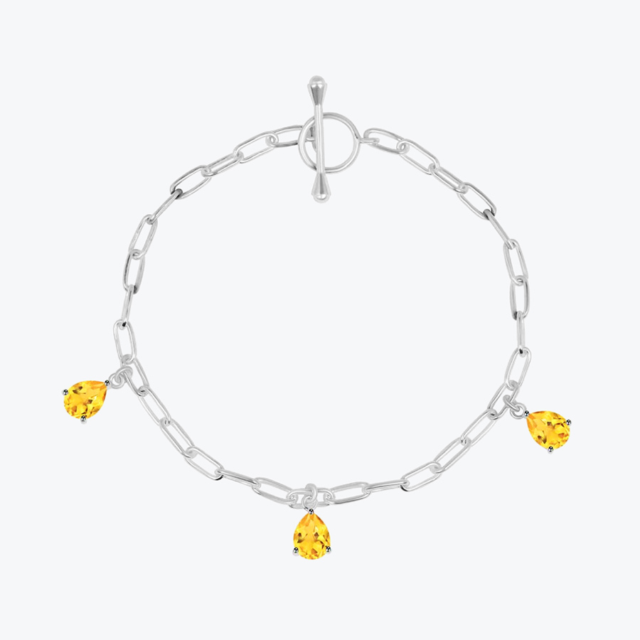 Dámský stříbrný náramek s broušeným citrínem a řetízkem s módními podlouhlými očky je naprosto magickým klenotem. Pokud máte ráda elegantní přírodní šperky a ráda při sobě nosíte minerální kameny, pak vám tento náramek rozhodně doporučujeme. Jedná se o slušivý a velice zajímavý kousek. Precizně zpracovaný náramek je ručně vyroben ze sterlingového stříbra Ag 925/1000 a je osazen třemi přívěsky citrínu.
