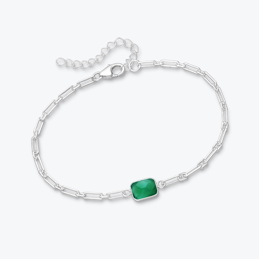 Hranatý podlouhlý řetízek dodává náramku moderní vzhled. Články mají čisté linie a pevnou strukturu, díky čemuž působí současně jemně i sebevědomě. Tvar náramku vytváří na zápěstí zajímavou texturu a krásně zachytává světlo při pohybu ruky. Jeho střed je ozdoben broušeným zeleným onyxem zasazeným do hladké stříbrné obruby.