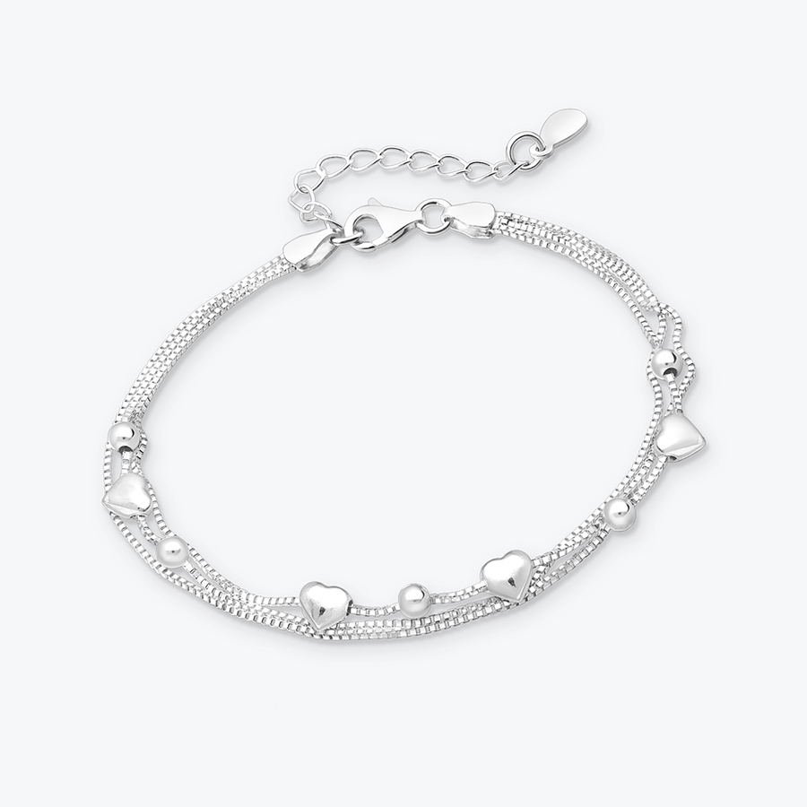 Dámský třívrstvý stříbrný náramek je nádherným šperkem, který perfektně podtrhne váš styl. Přináší jemnou kombinaci blýskavých korálků a roztomilých srdíček. Každá jeho vrstva jemně objímá zápěstí, působí velice elegantně a zaujme na první pohled.